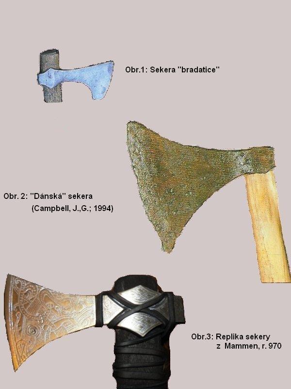 Bojová sekera měla mnoho variant, nejčastější však byly dva typy - SKEGGÖX (bradatice, obr.1) a BREIDOX (široká sekera, dánská sekera, obr.2). Od sebe se lišily kromě tvaru především obdobím, ve kterém se používaly. Bradatice je starším typem. Její ostří je ve spodní části protaženo dolů a jak název napovídá, připomíná kozí bradku. Mladším typem byla tzv. široká sekera, která měla tvar pravidelného lichoběžníka. Široké sekery byly obecně větší než bradatice a byly průraznější, aby lépe prošli kroužkovým brněním. Běžně používány byly kolem roku 1000.
